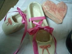 7月末に子どもたちと体験した陶芸。 作品が出来上がりましたぁ♪ 色付けは先生にお願いしたのですが。。 満足の仕上がりで大喜びです。 一生懸命に作ったとはいえ 出来上がりには とても不安が残る作品でしたが… 息子はナイキのバスケットシューズとバスケボール。 娘はバレエのトウシューズ。 ワタクシは花器。 土に触れ作品を作るなんてとても素晴らしい、貴重な体験でした。 またやりたい。。とハマッてしまいました。