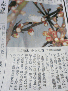 ご神木の飛梅が一輪だけ白い八重の花をつけたそうです